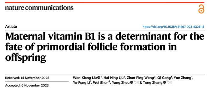 Recently, the research team of Prof. Zhang Teng and Prof. Zhou Yang with the State Key Laboratory of Reproductive Regulation and Breeding of Grassland Livestock of IMU has published in the Nature-index top journal of Nature Communications, the research article titled “Maternal vitamin B1 is a determinant for the fate of primordial follicle formation in offspring”. The research found that maternal high fat intake during pregnancy induced vitamin B1 insufficiency in maternal gut microbiota and led to mitochondrial dysfunction of germ cells and impairment of granulosa cells of female offspring, which had an influence on the formation of primordial follicle pool. It was also found that the vitamin B1 supplementation could boost the metabolism of acetyl-CoA in the ovaries of female offspring, which promotes the modification of histone acetylation and chromatin accessibility, improves the mitochondrial function, enhances the granulosa cell proliferation and restores the reserve of primordial follicles. This research work reveals the lasting effect of non-gamete transmission from mother-to-offspring during pregnancy on the reproductive health of offspring.