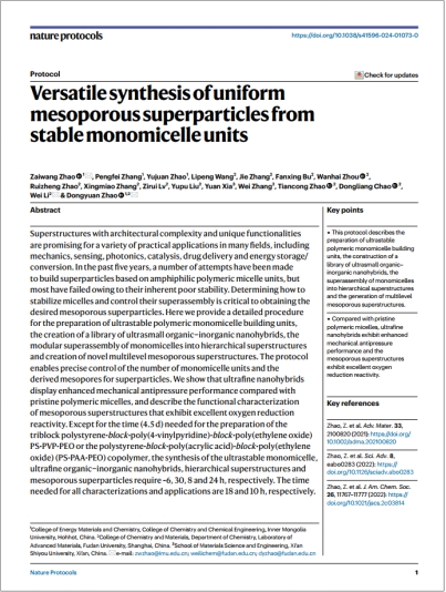 近日,我校名誉校长、能源材料化学研究院院长赵东元院士和能源材料化学研究院赵再望研究员在Nature Protocols(方法学领域的顶级期刊)上发表了题为“Versatile synthesis of uniform mesoporous superparticles from stable monomicelle units”的科研论文。该论文系统介绍一种“超稳定”的聚合物单胶束组装基元,并以此为组装单元构筑了多种分级介孔超颗粒。