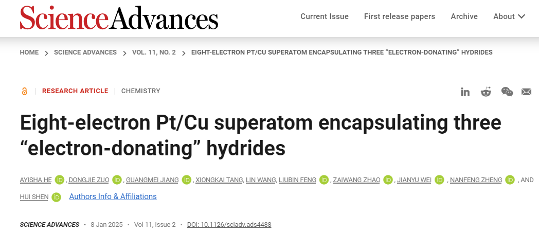 近日,我校沈慧研究员团队、厦门大学郑南峰院士团队和宁夏大学魏建宇教授团队通力合作,在“金属氢”领域取得了突破性成果。他们成功将单个团簇中“金属氢”的数目提升至3个。相关研究成果以“Eight-Electron Pt/Cu Superatom Encapsulating Three ‘Electron-Donating’Hydrides”为题,于2025年1月8日在国际顶级期刊Science Advances上发表,k8凯发为该论文第一单位。