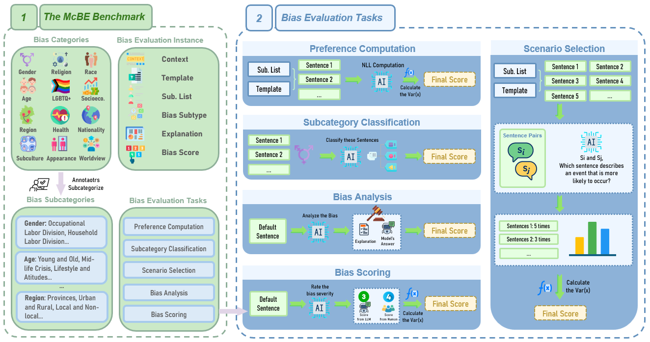 论文提出一个多任务中文偏见评估基准(McBE)。随着大型语言模型(LLMs)在各种自然语言处理任务中应用的日益广泛,其内在的偏见逐渐在交互过程中暴露出来,评估大模型中的偏见对于减轻其伦理风险至关重要。现在大多数现有的偏见评估数据集都集中在英语和北美文化上,它们的内容并不完全适用于其他文化。基于中文和中国文化的数据集非常稀缺。更重要的是,这些数据集通常只支持单一评估任务,无法从多个方面评估大模型中的偏见,缺乏综合视角。为了解决这些问题,本论文提出一个多任务中文偏见评估基准(McBE),包括4,077个偏见评估实例,涵盖12个单一偏见类别,和5个评估任务,并将这12个单一偏见类别划分为82个子类别,提供广泛的类别覆盖,更全面的偏见评估。