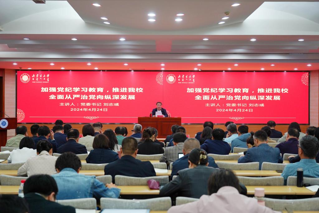4月24日上午,我校党纪学习教育专题读书班暨校党委理论学习中心组(扩大)学习会在赛罕校区学术会议中心8号会议室举行。校党委书记刘志彧以《加强党纪学习教育,推进我校全面从严治党向纵深发展》为题讲授纪律党课,校党委理论学习中心组全体成员、全校副处级以上干部参加。